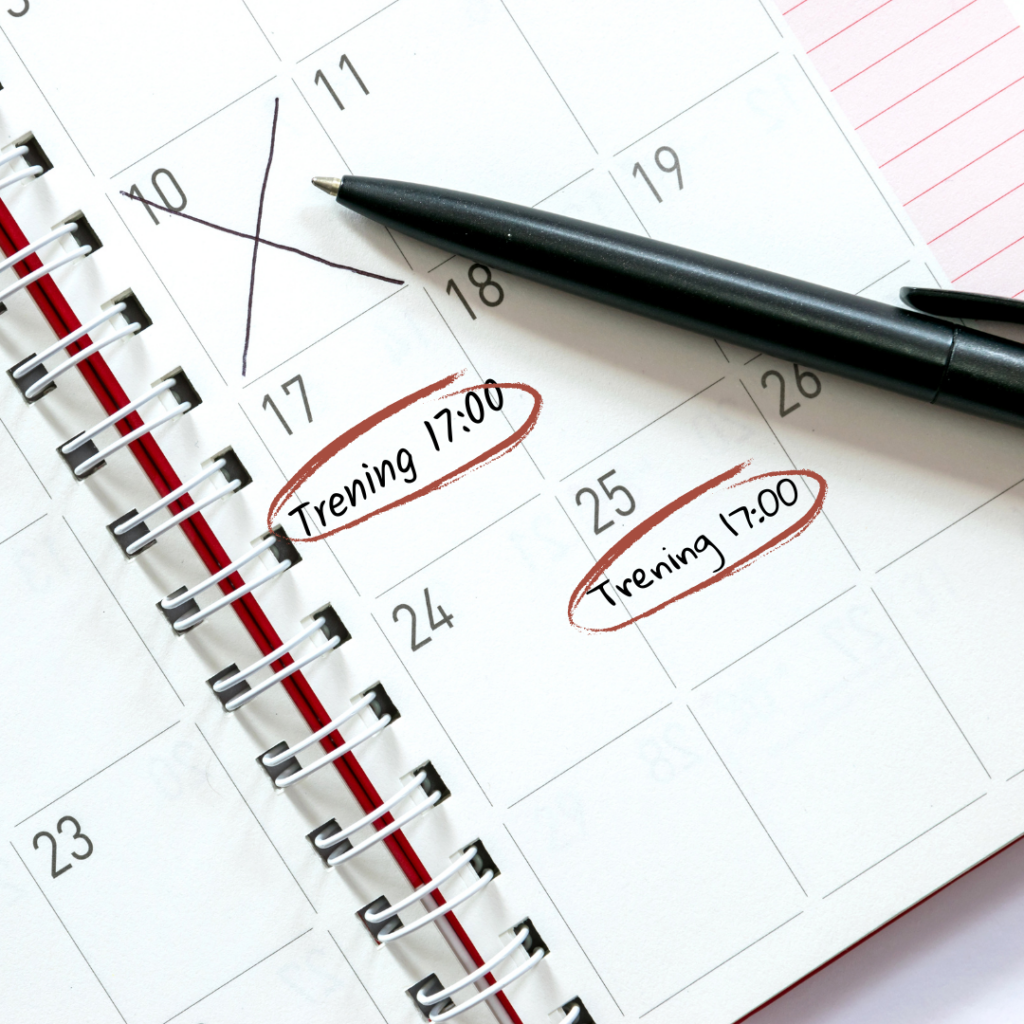Po dokonaniu analizy, uwzględniając wszystkie czynniki, które rozpisałaś zaplanuj swoje treningi w kalendarzu jako priorytetowe wydarzenia. Traktuj je jak ważne spotkania i odhaczaj je po zakończonym treningu, czerpiąc satysfakcję z wykonania zadania. Jeżeli to możliwe zapisz wyjście na siłownie z tygodniowym, a nawet miesięcznym wyprzedzeniem, żeby w tym czasie nie wpisywać innych zobowiązań.
